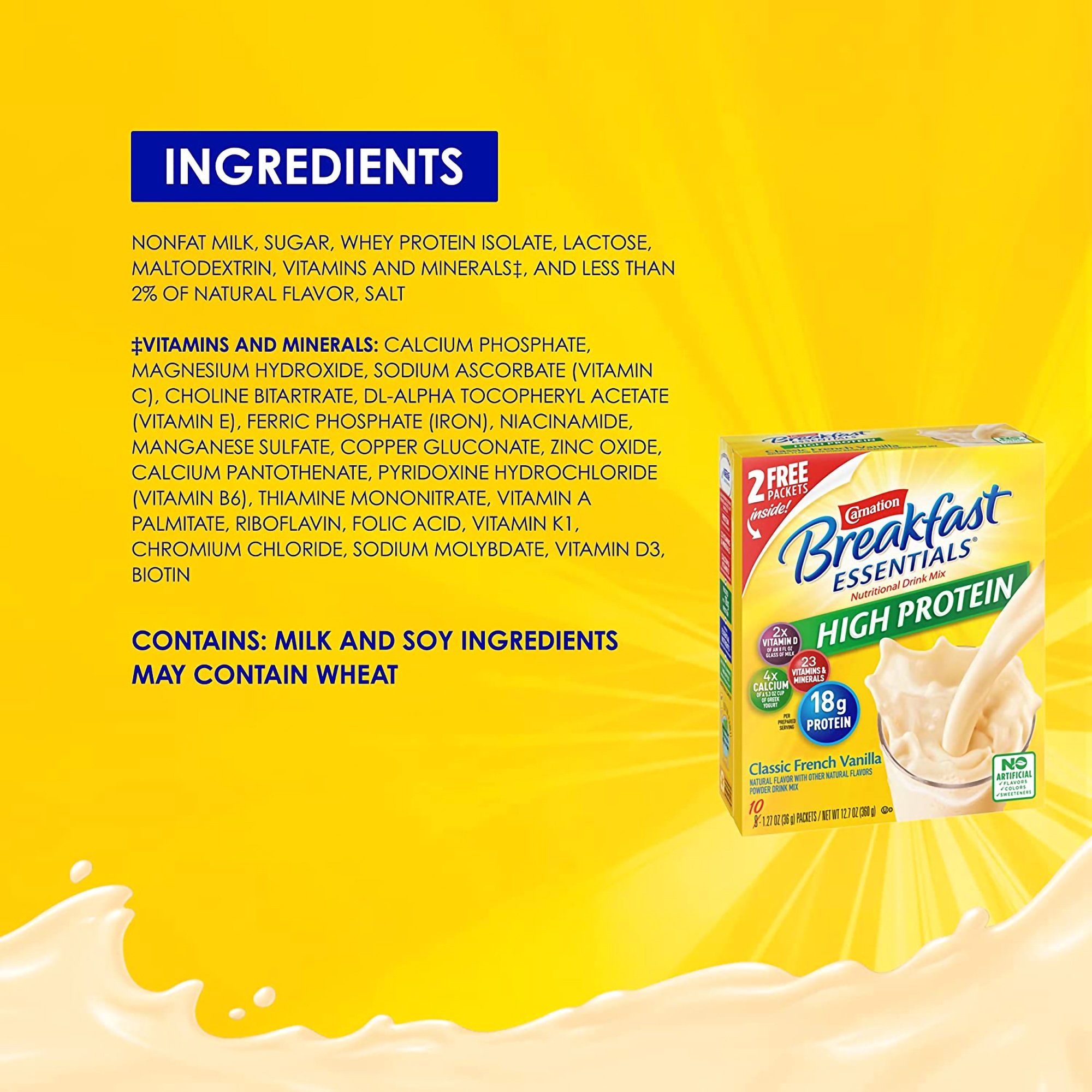 Carnation Breakfast Essentials High Protein Vanilla is a convenient nutritional supplement designed to support active lifestyles and daily nutritional needs. Each individual packet provides 18 grams of protein, which is three times the amount found in an egg, making it an excellent choice for those seeking to increase their protein intake easily. The formula also delivers four times more calcium than a typical 5.3-ounce cup of Greek yogurt, supporting bone health and muscle function. By mixing this powder with an 8-fluid-ounce glass of milk, you can double your intake of vitamin D, which aids calcium absorption and promotes overall wellness.
