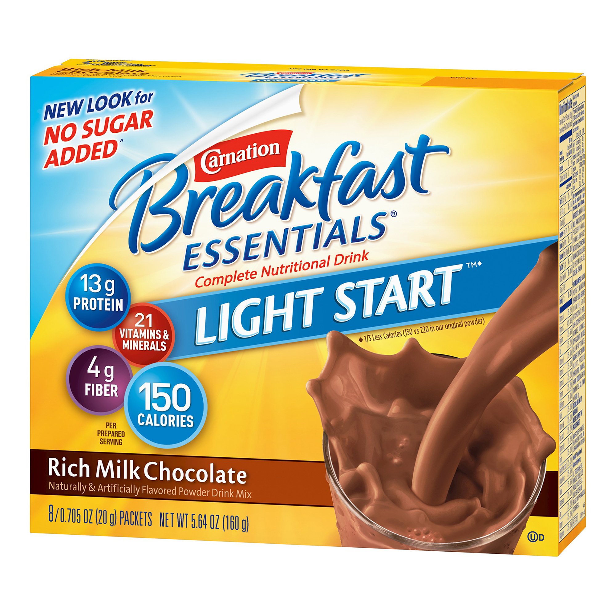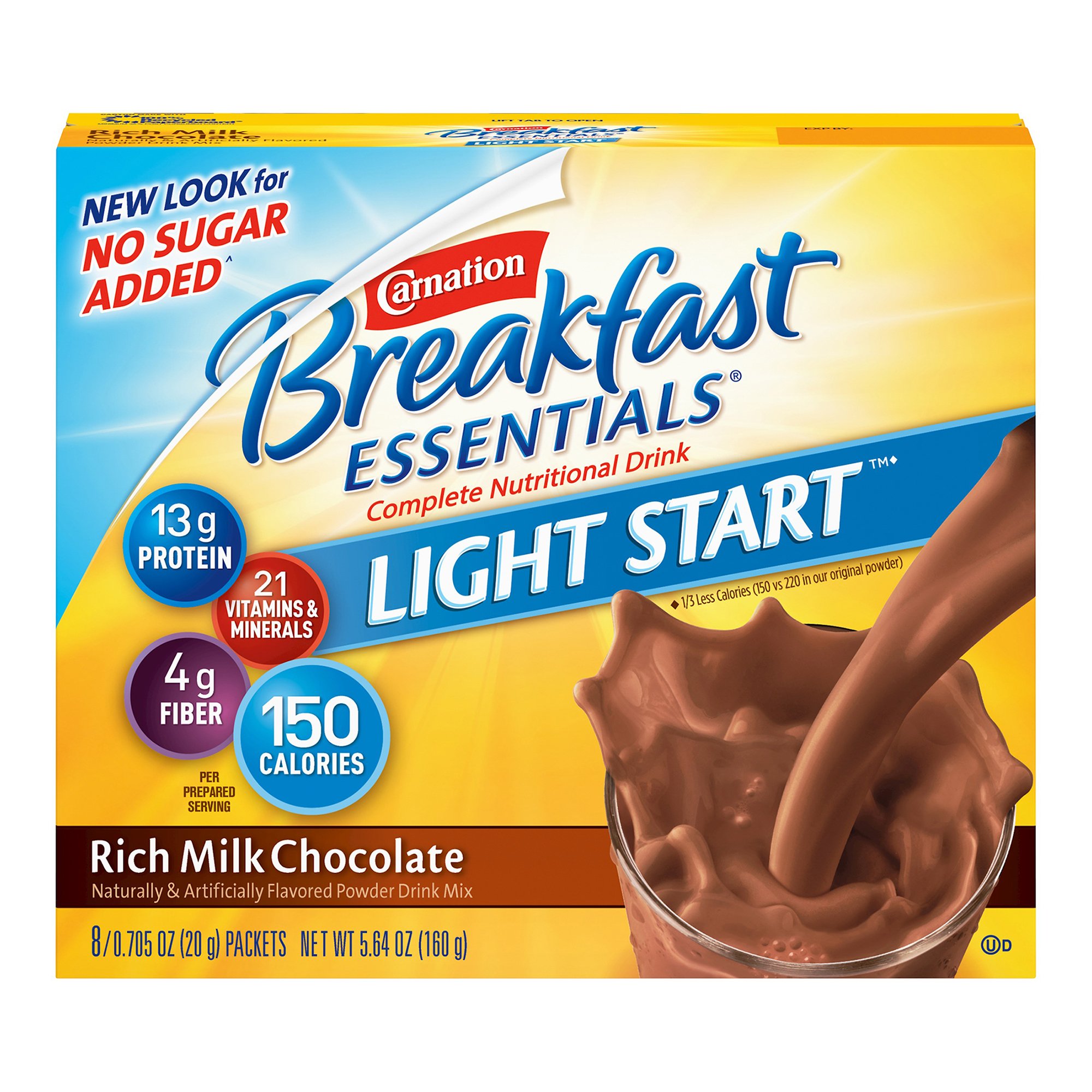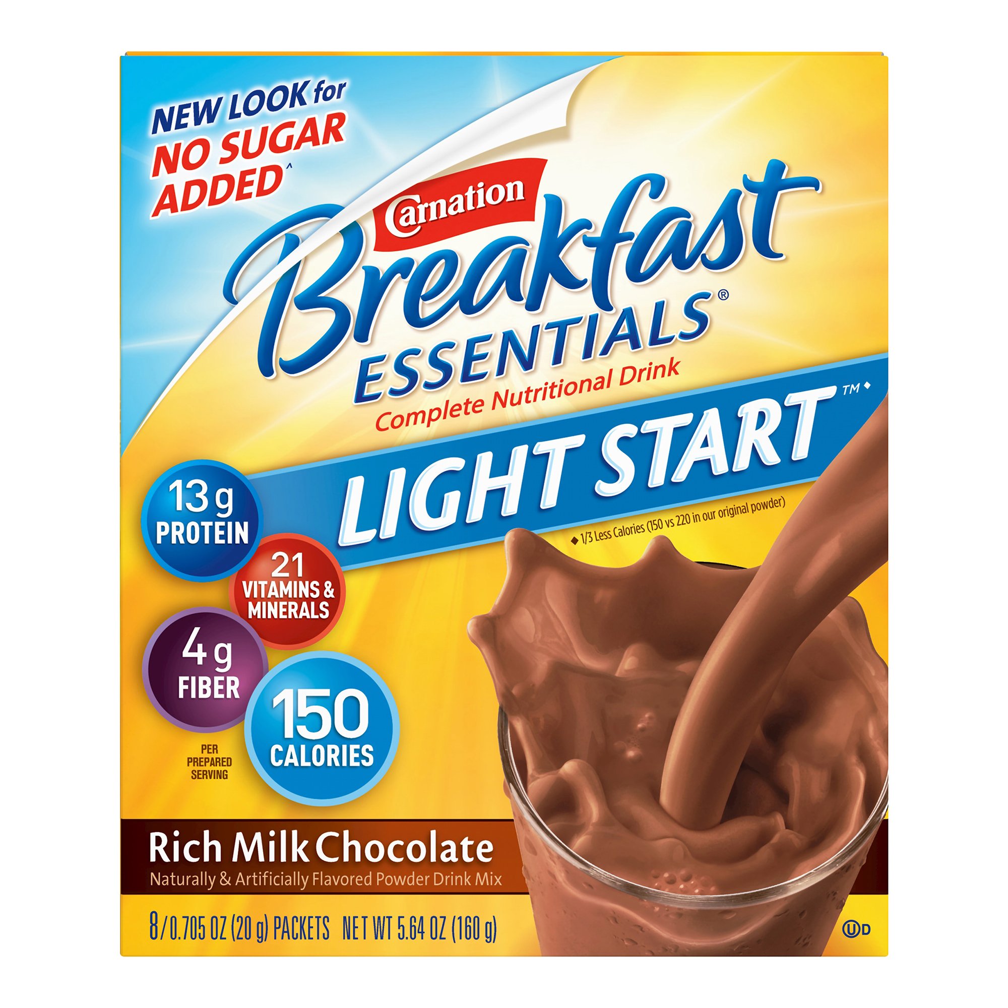 Enjoy a nutritious and delicious start to your day with Carnation Breakfast Essentials Light Start Chocolate, an instant powder supplement designed for ages 4 and older. Each individual packet provides approximately 150 calories, delivering a balanced blend of essential nutrients, including 23 grams of total carbohydrates, 1 gram of fat, and 13 grams of protein to support muscle maintenance and overall energy. The rich milk chocolate flavor makes it an appealing choice for those seeking a tasty way to boost their daily nutrition.
