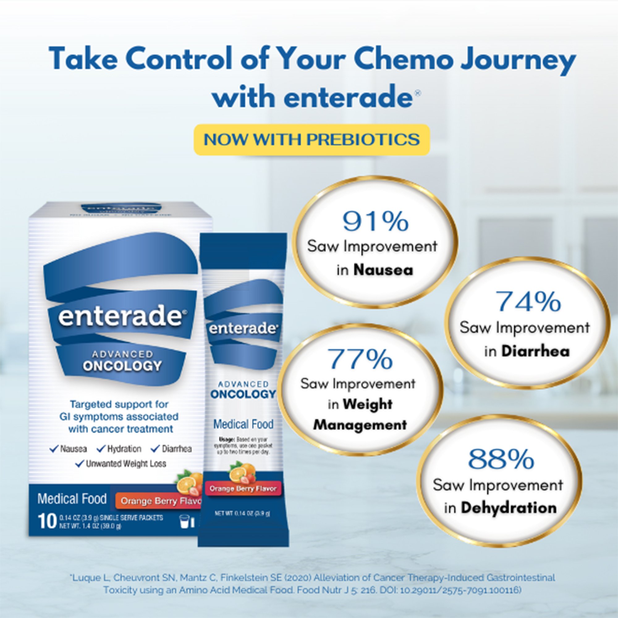 The enterade® Advanced Oncology Formula in Orange-Berry flavor is a glucose-free medical food designed specifically for adults undergoing cancer treatments. This powder is clinically proven to help manage common symptoms such as nausea, diarrhea, dehydration, and weight loss, which are often associated with oncological therapies. Each single-serve packet provides a convenient way to support gastrointestinal health, rebuild and rehydrate the body, and promote recovery during challenging treatment periods.