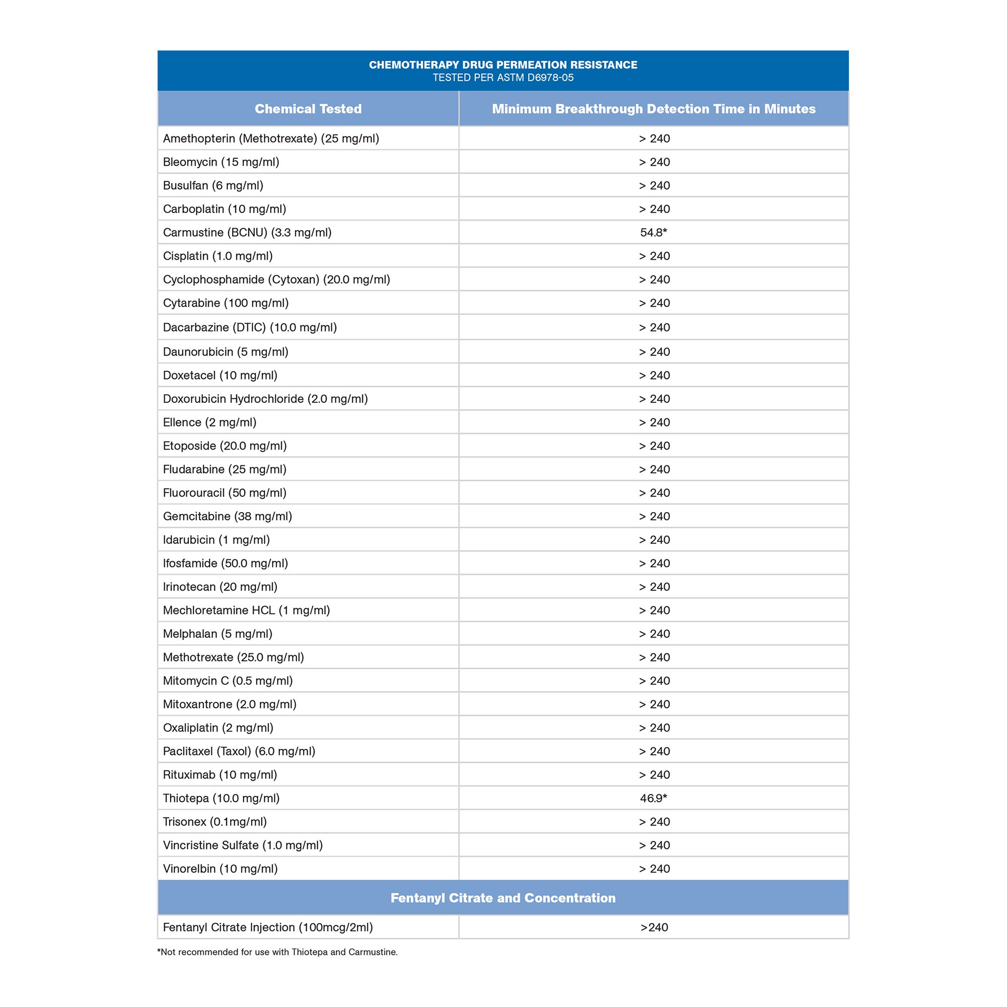 * Resistant to permeation by 32 chemotherapy drugs, meeting ASTM standards