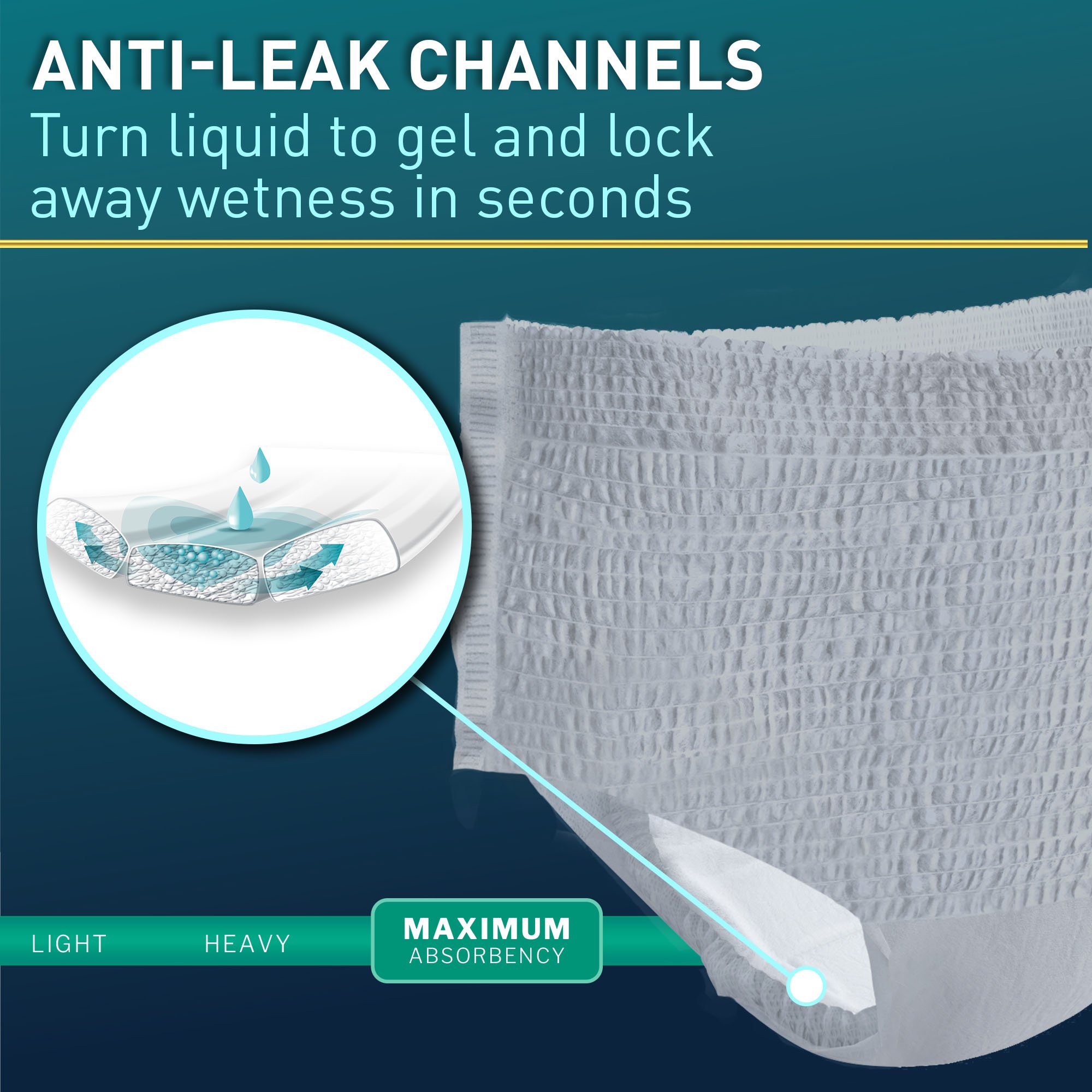 • Maximum absorbency for reliable protection against leaks and wetness