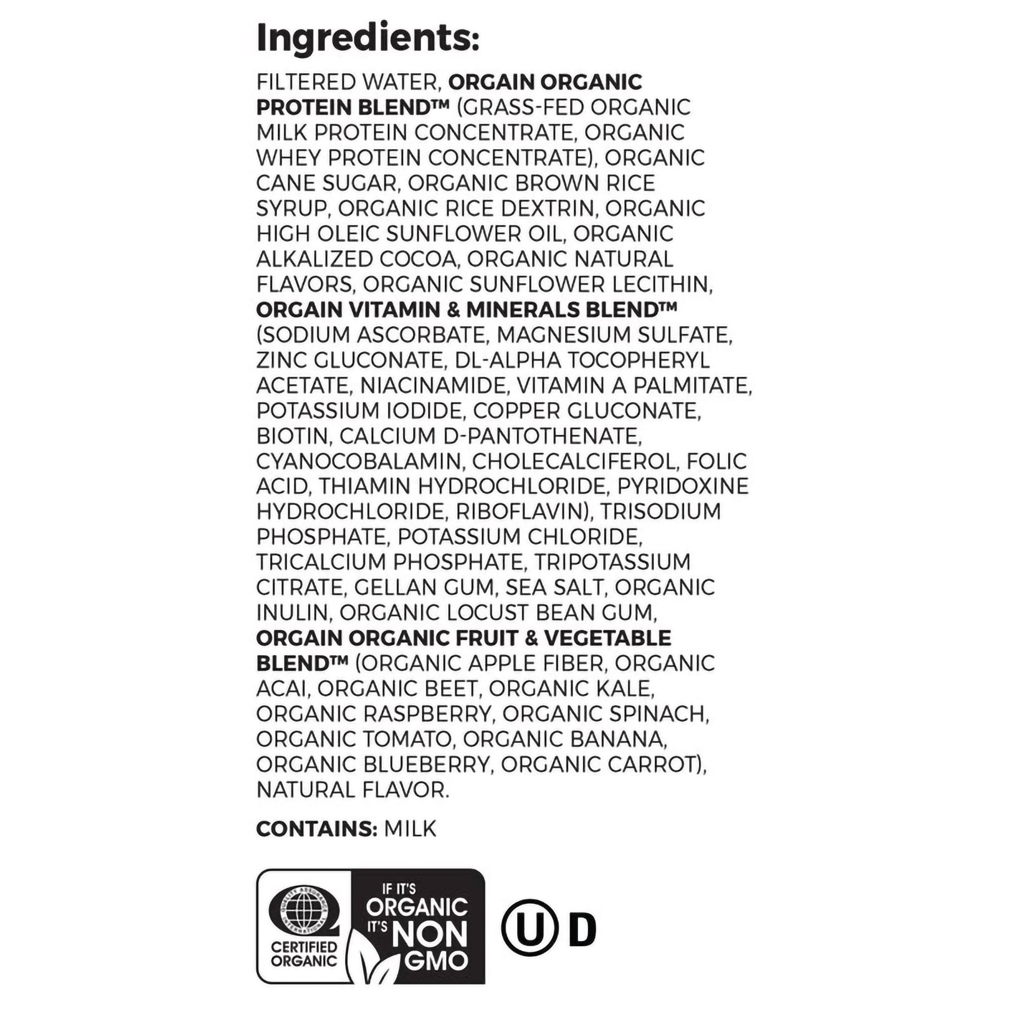 Filtered Water, Orgain Organic Fruit and Vegetable Blend, Orgain Organic Portein Blend-Grass-fed Organic Milk Protein Concentrate, Orgain Vitamin and Minerals Blend, Organic Alkalized Cocoa, Organic Brwon Rice Syrup, Organic Cane Sugar, Organic High Oleic Sunflower Oil, Organic Natural Flavors, Organic Rice Dextrin, Organic Sunflower Lecithin, Organic Whey Protein Concentrate