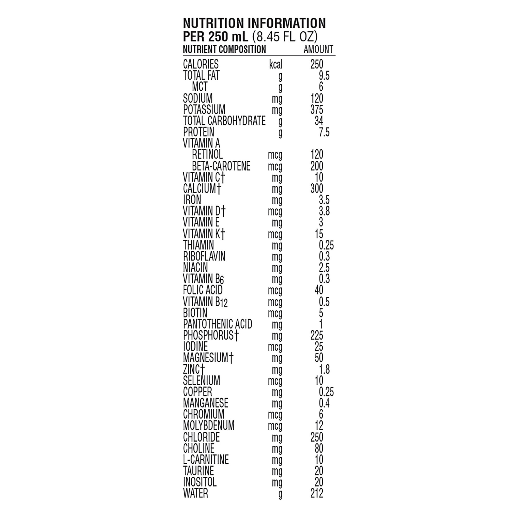 WATER, MALTODEXTRIN, ENZYMATICALLY HYDROLYZED WHEY PROTEIN (MILK), MEDIUM CHAIN TRIGLYCERIDES, AND LESS THAN 2% OF CORNSTARCH, VITAMINS AND MINERALS‡, SOYBEAN OIL, CANOLA OIL, SOY LECITHIN, GUAR GUM, SALT, VITAMINS AND MINERALS: CALCIUM PHOSPHATE, MAGNESIUM CHLORIDE, POTASSIUM CHLORIDE, SODIUM PHOSPHATE, POTASSIUM CITRATE, POTASSIUM PHOSPHATE, CHOLINE CHLORIDE, CALCIUM CITRATE, SODIUM ASCORBATE, TAURINE, MAGNESIUM OXIDE, L-CARNITINE, INOSITOL, FERROUS SULFATE, SODIUM CITRATE, ZINC SULFATE, DL-ALPHA TOCOPHERYL ACETATE, NIACINAMIDE, CALCIUM PANTOTHENATE, MANGANESE SULFATE, COPPER SULFATE, PYRIDOXINE HYDROCHLORIDE, RIBOFLAVIN, THIAMINE MONONITRATE, VITAMIN A PALMITATE, BETA-CAROTENE, FOLIC ACID, POTASSIUM IODIDE, SODIUM SELENATE, CHROMIUM CHLORIDE, VITAMIN K1, BIOTIN, VITAMIN D3, VITAMIN B12