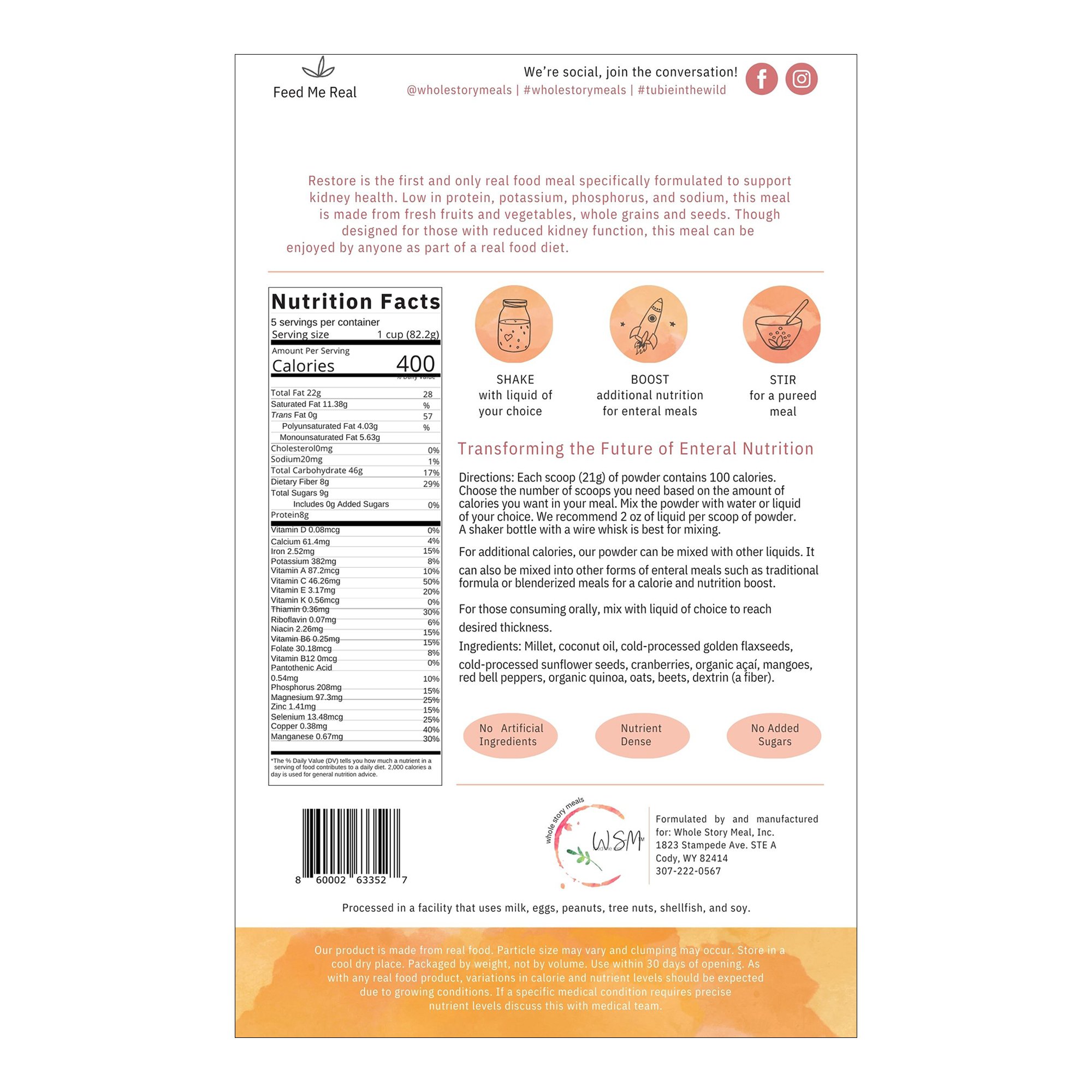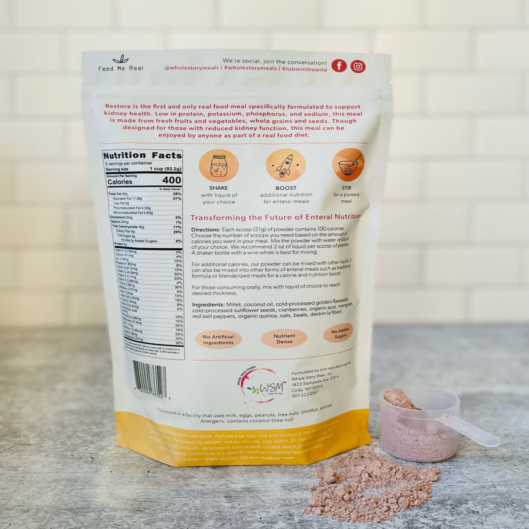 Restore Renal Support offers a specially formulated powdered supplement designed to support kidney health for individuals aged one year and up. This 16 oz. pouch contains a nutrient-rich blend of ingredients including millet, coconut oil, golden flaxseeds, sunflower seeds, cranberries, organic acai, mangoes, red bell peppers, organic quinoa, oats, beets, and dietary fiber dextrin. Each serving provides approximately 400 calories, making it a nourishing addition to daily routines. The supplement can be administered orally or via tube, accommodating various patient needs and preferences.