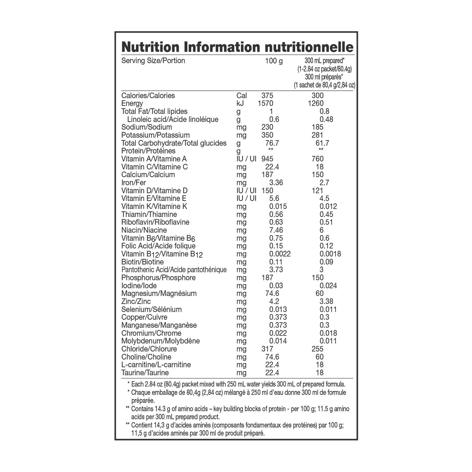 | ingredients | MALTODEXTRIN, MODIFIED CORN STARCH, L-LEUCINE, AND LESS THAN 2% OF L-GLUTAMINE, MAGNESIUM GLUCONATE, L-ARGININE ACETATE, L-ISOLEUCINE, L-VALINE, CALCIUM GLYCEROPHOSPHATE, SAFFLOWER OIL, L-LYSINE ACETATE, L-ASPARTIC ACID, L-ALANINE, L-PHENYLALANINE, L-PROLINE, SODIUM CITRATE, POTASSIUM CITRATE, GLYCINE, L-THREONINE, L-HISTIDINE HYDROCHLORIDE, L-SERINE, L-CYSTINE HYDROCHLORIDE, L-METHIONINE, SODIUM PHOSPHATE, POTASSIUM CHLORIDE, CHOLINE BITARTRATE, L-TRYPTOPHAN, POTASSIUM SORBATE AND ASCORBYL PALMITATE AND TOCOPHEROLS AND BHA AND BHT (TO PRESERVE FRESHNESS), L-TYROSINE, ASCORBIC ACID, TAURINE, POLYSORBATE 80, L-CARNITINE, DL-ALPHA-TOCOPHERYL ACETATE, ZINC SULFATE, FERROUS SULFATE, NIACINAMIDE, VITAMIN A PALMITATE, CALCIUM PANTOTHENATE, COPPER GLUCONATE, VITAMIN D3, MANGANESE SULFATE, PYRIDOXINE HYDROCHLORIDE, THIAMINE HYDROCHLORIDE, RIBOFLAVIN, CHROMIUM CHLORIDE, FOLIC ACID, BIOTIN, POTASSIUM IODIDE, SODIUM SELENITE, SODIUM MOLYBDATE, VITAMIN K1, VITAMIN B12 |