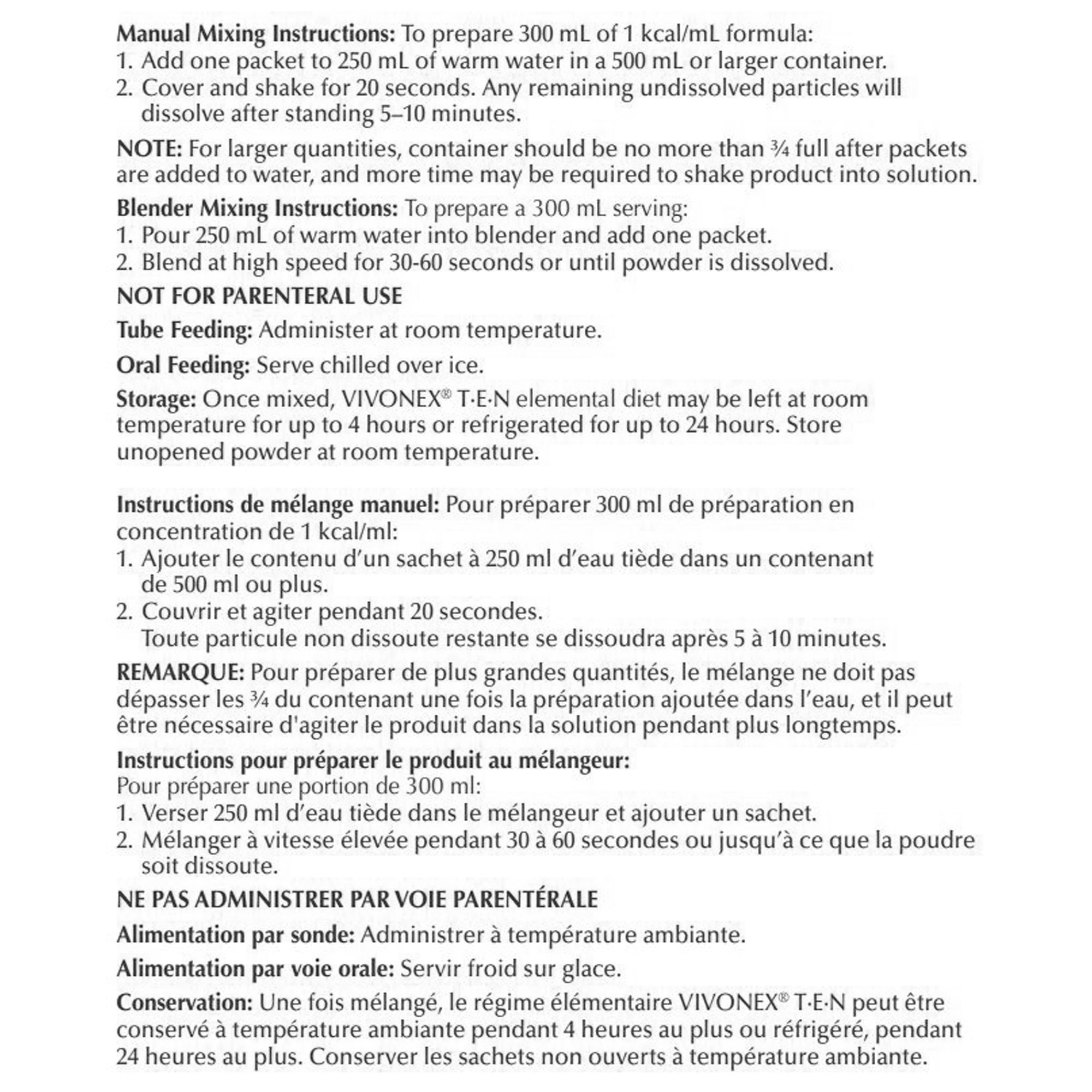 Vivonex T.E.N. from Nestle is a specialized elemental nutritional powder designed to support individuals with severe gastrointestinal impairments. Each individual packet provides approximately 300 calories, making it suitable for supplemental feeding via oral or tube administration. This formula is formulated with a minimal fat content, delivering only 3% of calories from fat, which helps promote gastric emptying and reduces pancreatic stimulation, essential for patients with compromised digestion. The product is ideal for use in transitional feeding, extensive bowel resection, malabsorption syndromes, post-operative care, or as an alternative to total parenteral nutrition (TPN). Its composition facilitates minimal digestive effort while providing comprehensive nutrient support including amino acids, vitamins, and minerals necessary for recovery and maintenance of health.